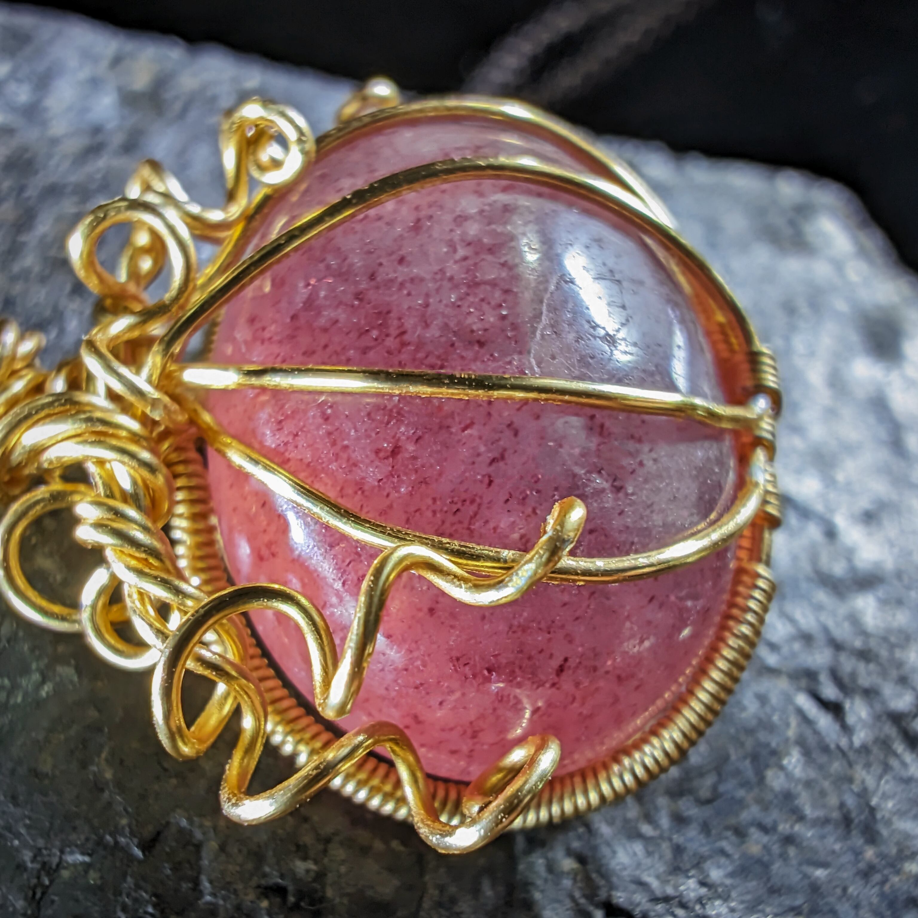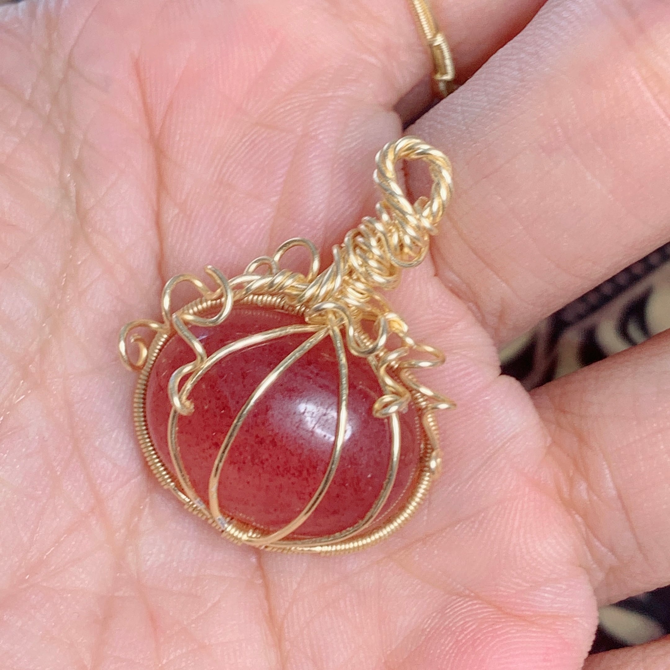 ハロウィンのかぼちゃをイメージした、可愛らしいピンクエピドート/ストロベリークォーツのワイヤーアートペンダントです。一点もので、特別なアクセサリーとなります。ペンダント紐が1本無料で付いております。長さ調整は可能となっております。ハンドメイドの繊細な作りで、思わず見惚れてしまう美しいデザインです。