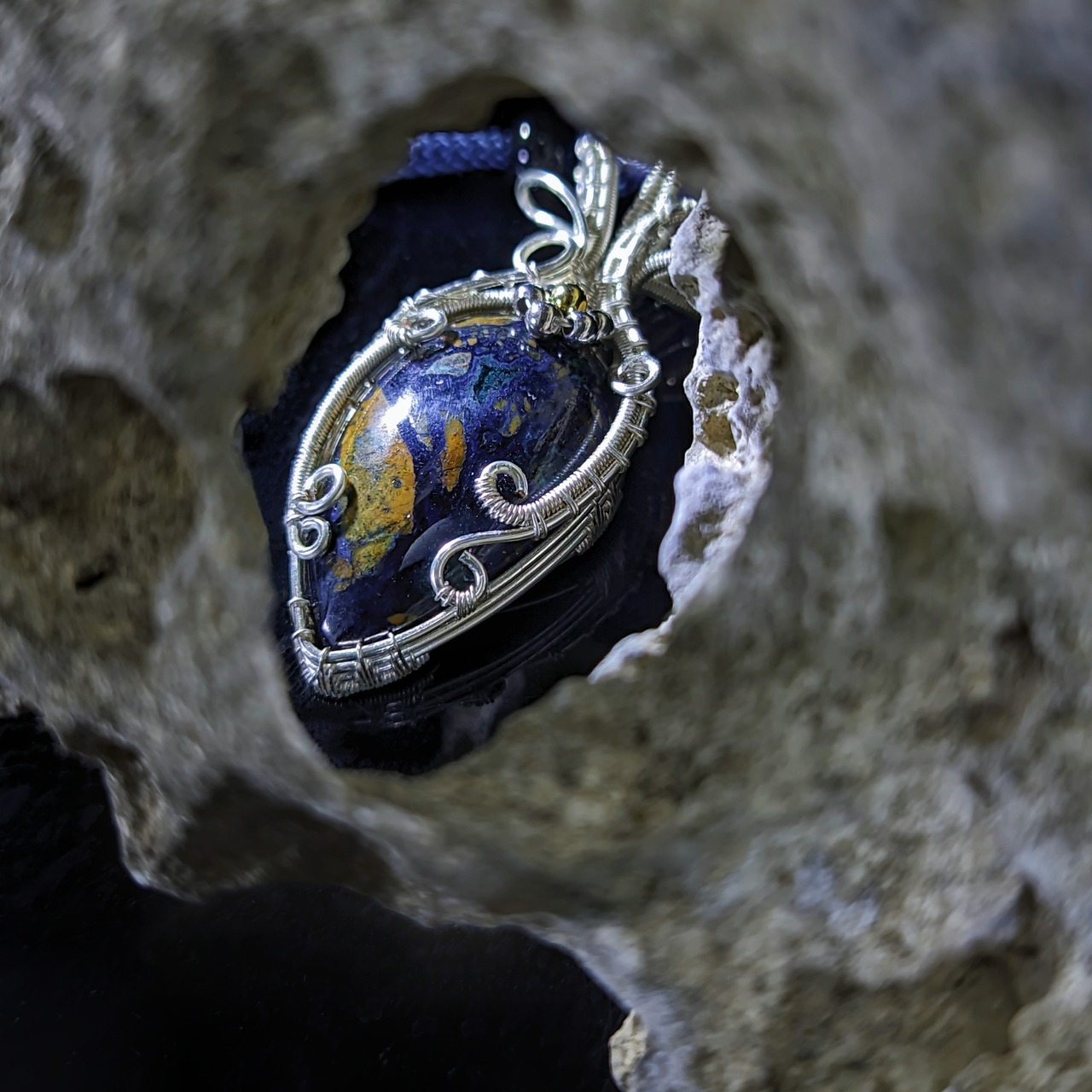 アズロマラカイトには、上空から、濃い目な海と美しい地球のようです。表と裏どちらから見ても引き込まれる魅力がありますね♬ 石を囲いものはゴールドメッキワイヤー。こちらのペンダントにはペンダント紐が1本無料で付いております。長さ調整は可能となっております。