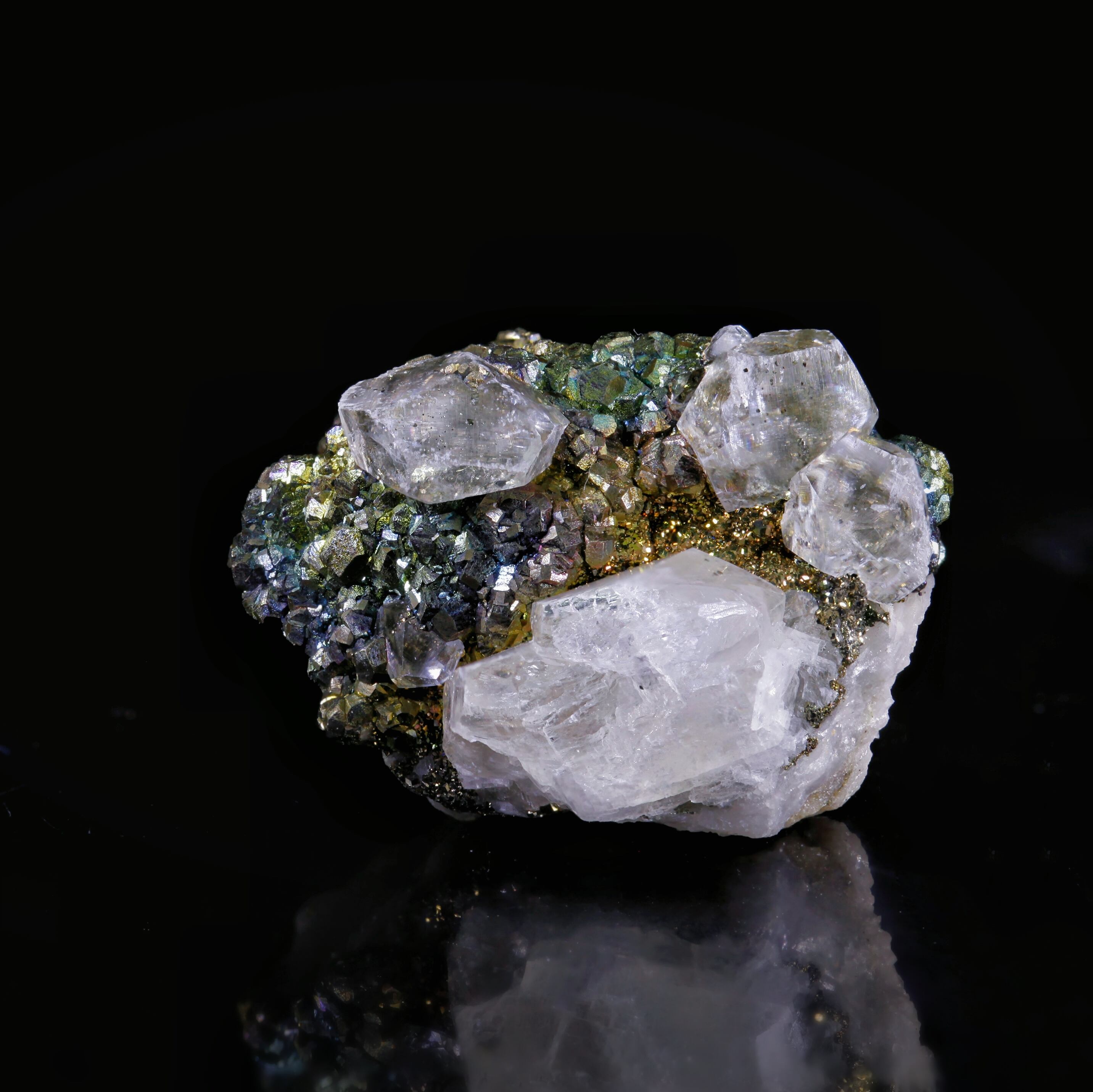 希少なパイライトの結晶は美しく、金属光沢な立方体でいっぱい、カルサイトと組み合わせのような結晶です。かっこいいです。