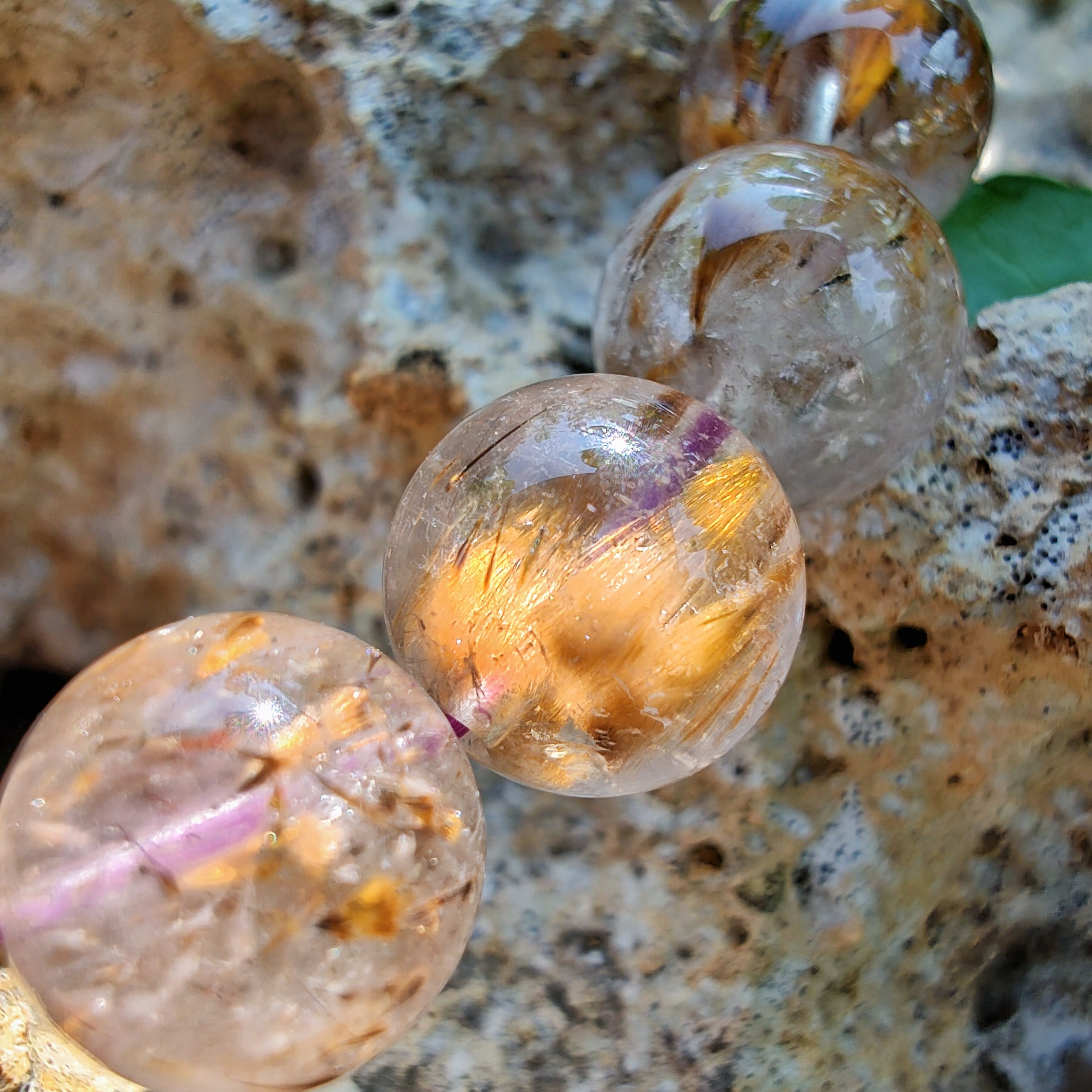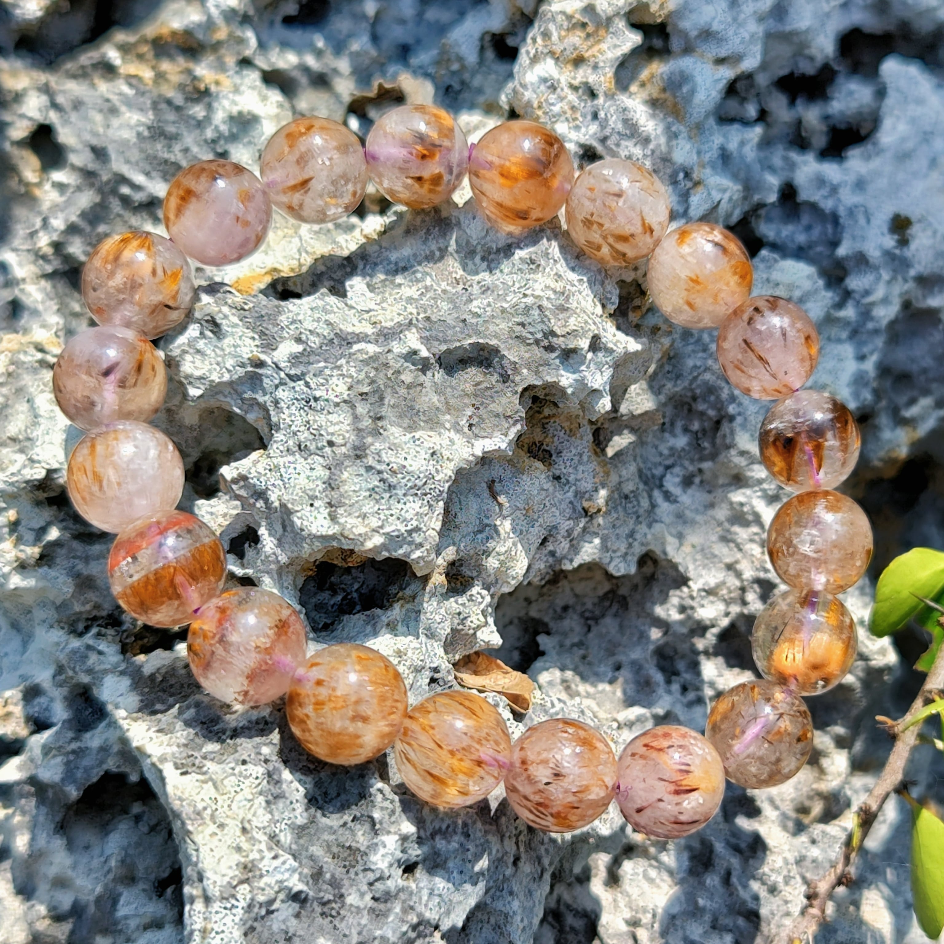 希少な宝石質のカコクセナイトブレスレット(又名:カコクセナイトインアメジスト、インクルージョンアメジスト、スーパーセブン)。薄い紫とゴールド色の内包物がよく溶け合っています。はっきりと羽が見える造形、美しい色合いでも抜群ですね。
