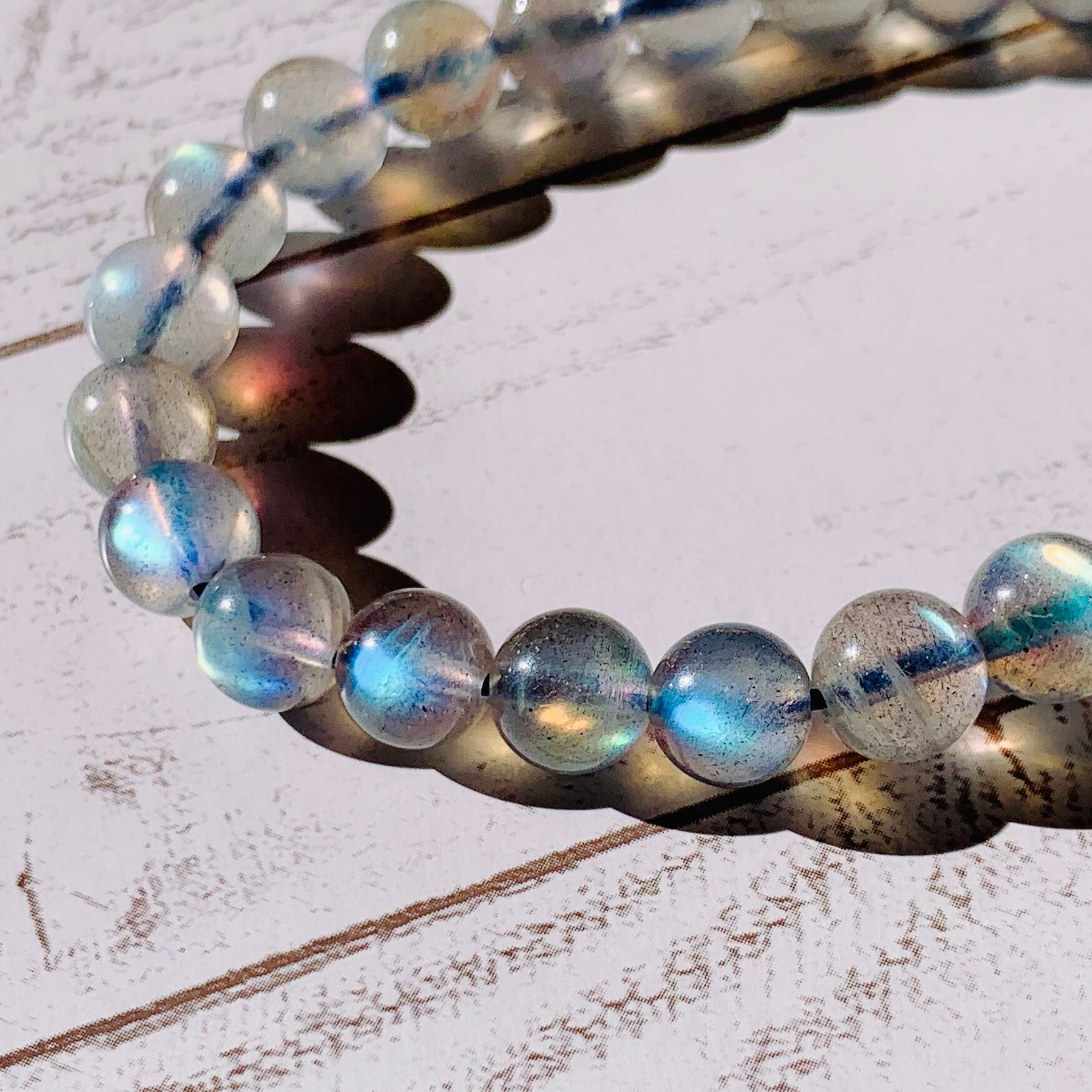 極上品のムーンストーンのブレスレットです。透明感が高く綺麗なブルーときいろのシラーが輝く、強いキャットアイ効果をやすい見える。持ち主を優しく大らかな愛情で満たしてくれるといわれています。