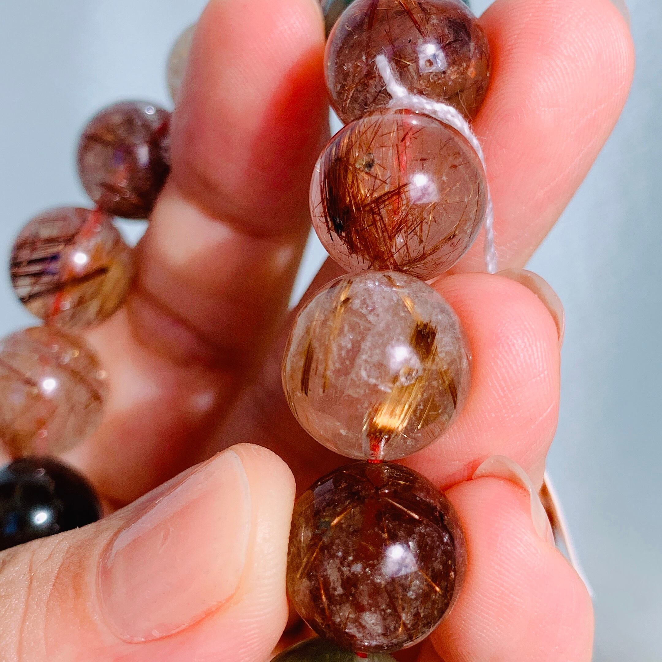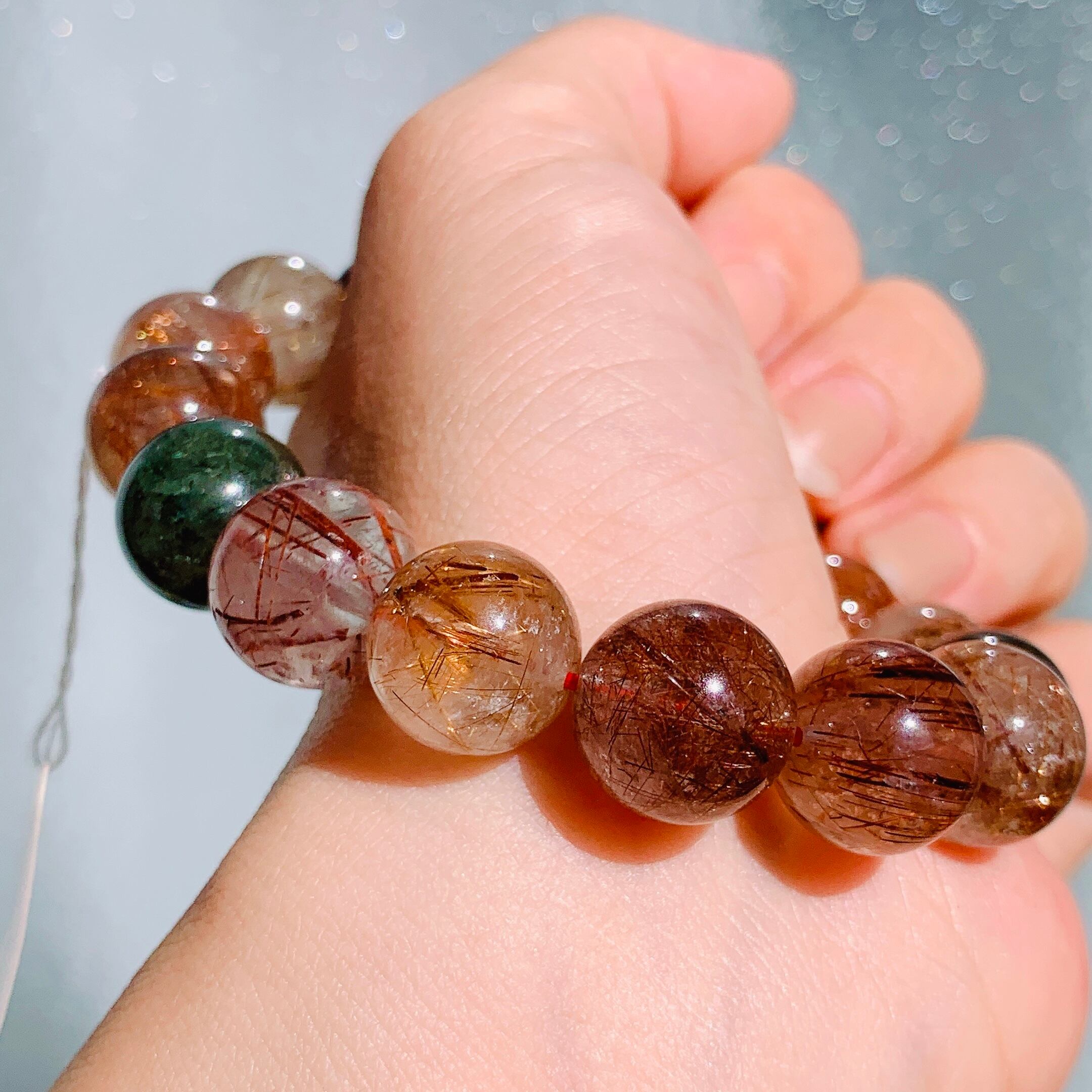 発色極上、水晶玉の中にふさふさした輝くルチルは気品を感じで、13.5ミリのミックスルチルクォーツです。このブレスレットには赤褐色、黄褐色、褐色、緑色がある、優しい色合いで肌なじみも抜群です!