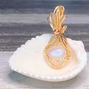ムーンストーンのペンダントトップです。ワイヤーでペンダントトップを作った、特別な感じがします。ムーンストーンはのシラーが輝きてうろこのようにきらきらと光っています。